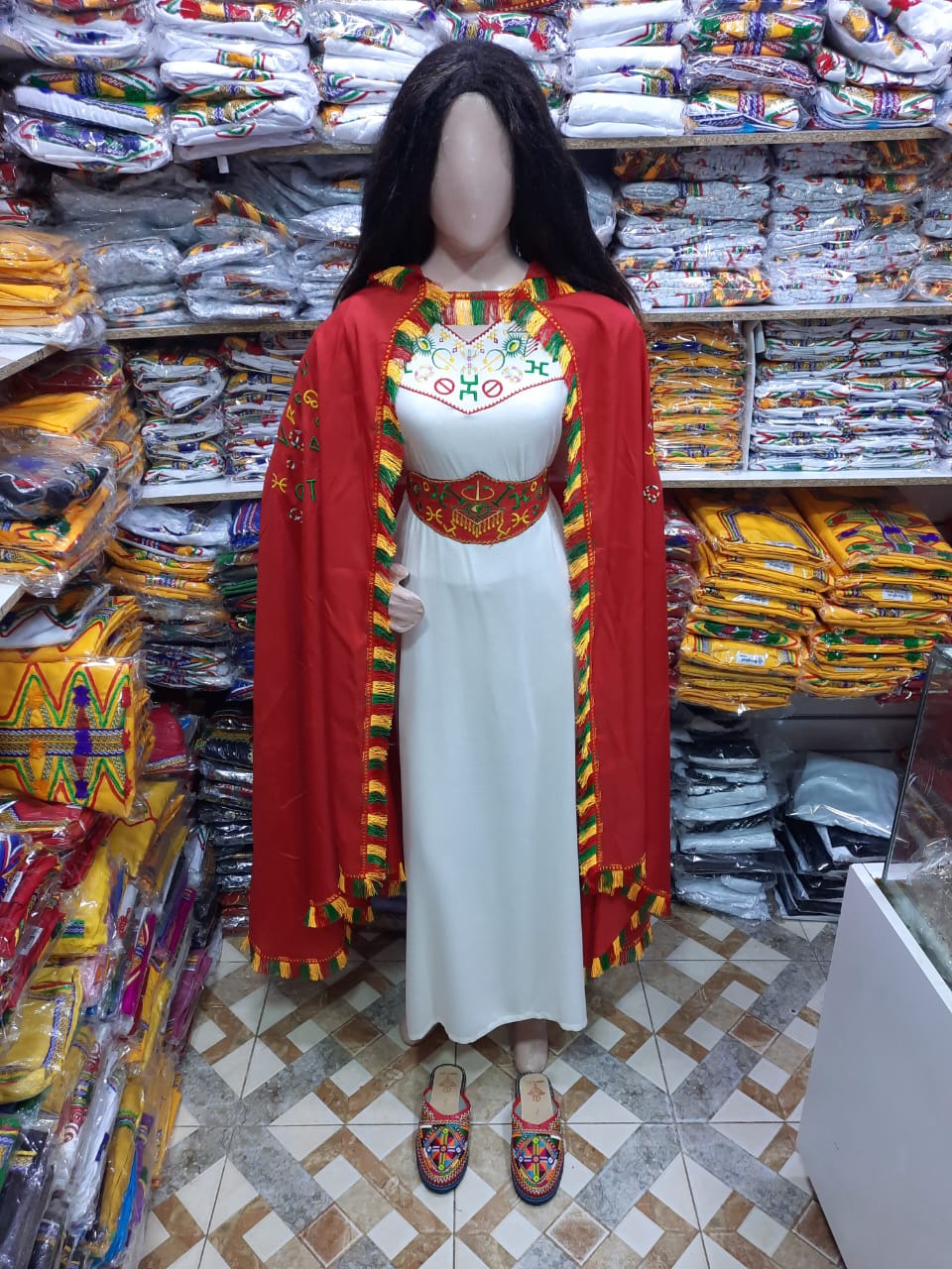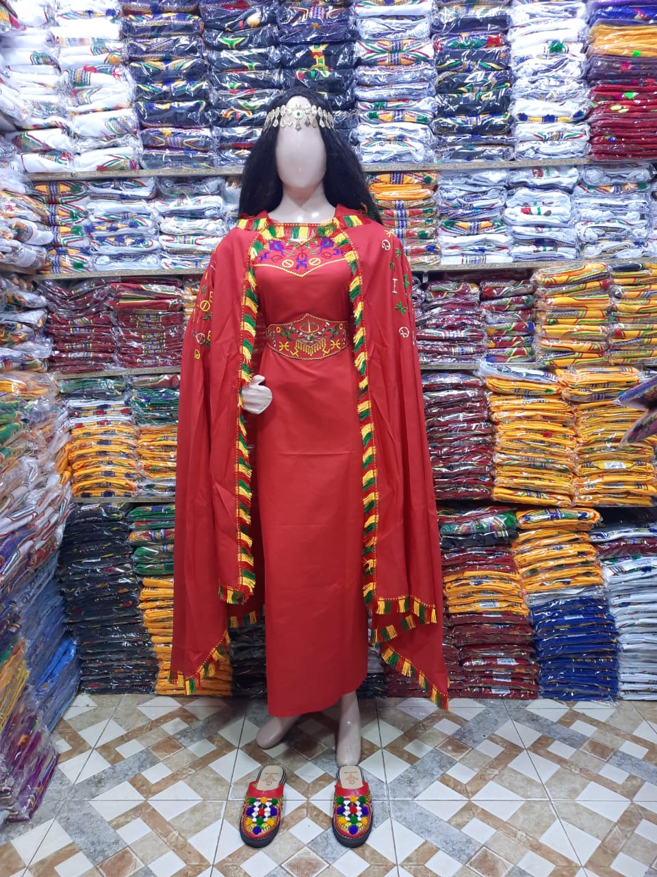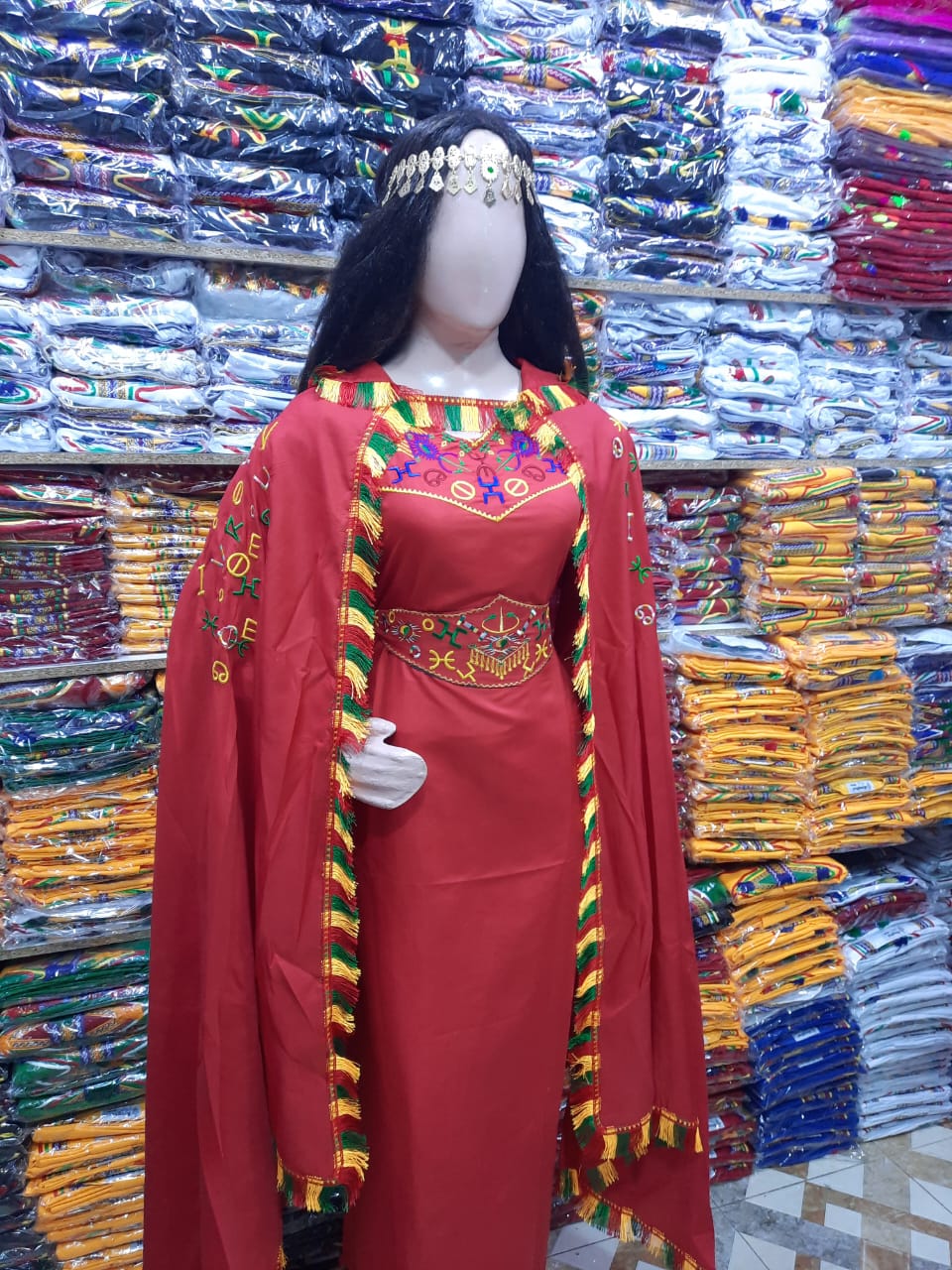 تتكوّن من عباية بقصّة انسيابية مريحة، حزام أنيق يبرز القوام ويمنح توازنًا جذابًا للإطلالة، وسلهام فاخر يضيف لمسة فخامة مستوحاة من اللباس الأمازيغي التقليدي.